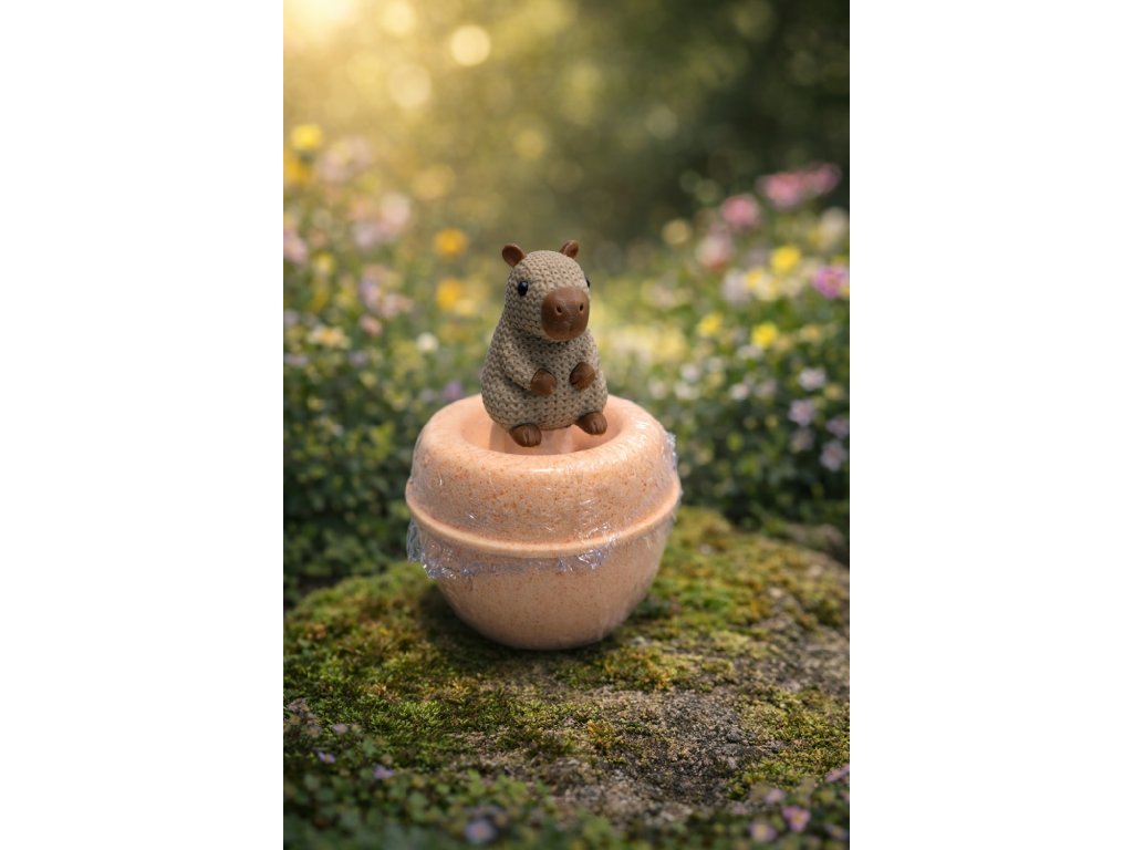 Při kontaktu s vodou se šumivka jemně rozpouští a uvolňuje bohatou pěnu, zatímco PLA figurka kapybary je krásnou dekorací – nezapomeňte ji před koupelí vyjmout, není určena do vody.